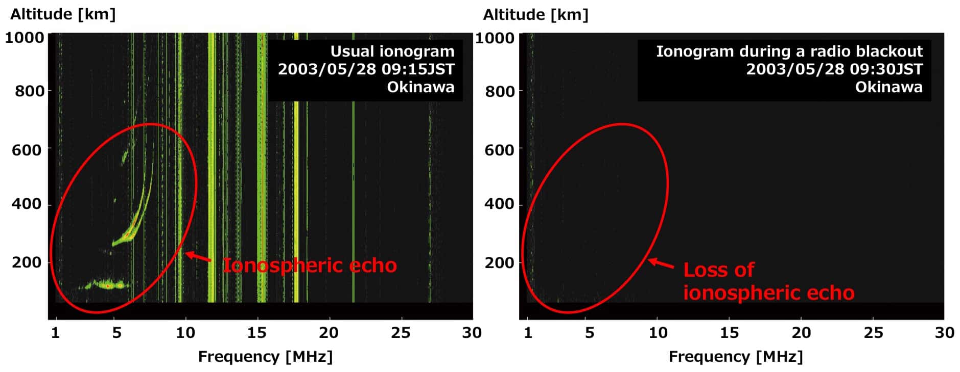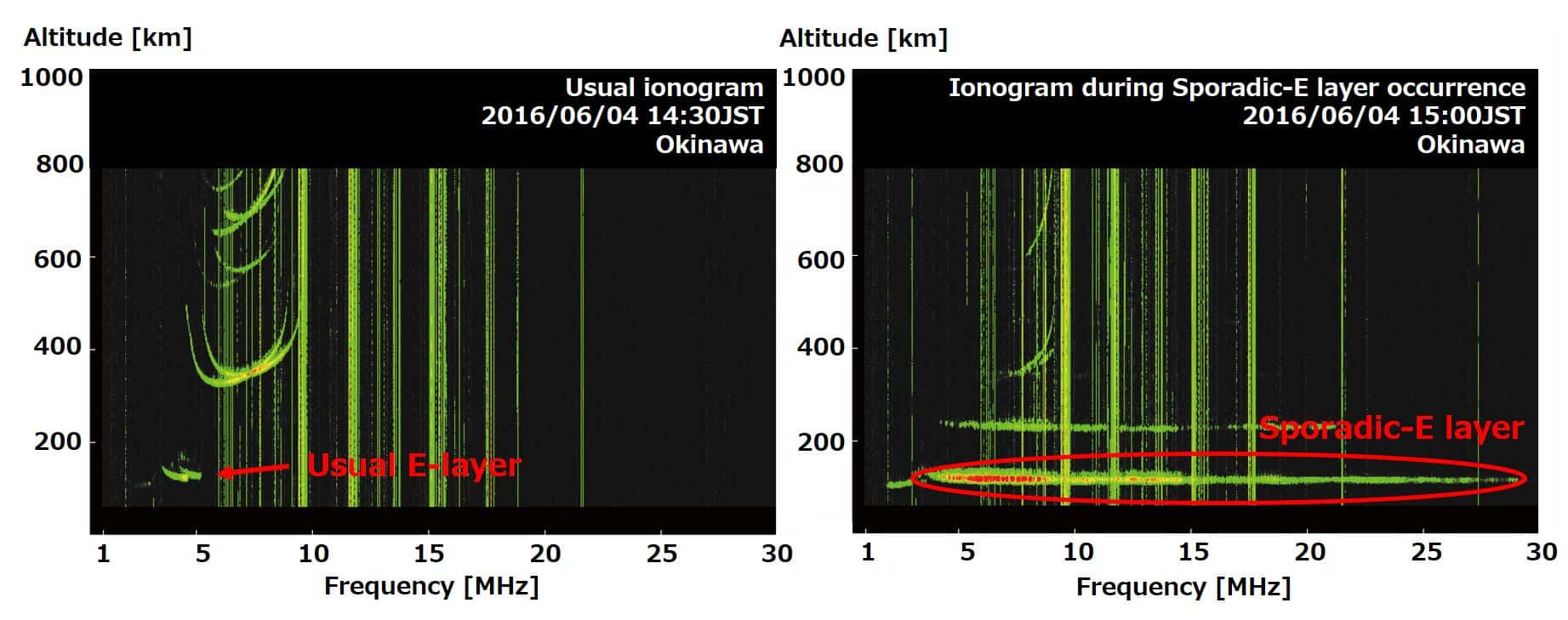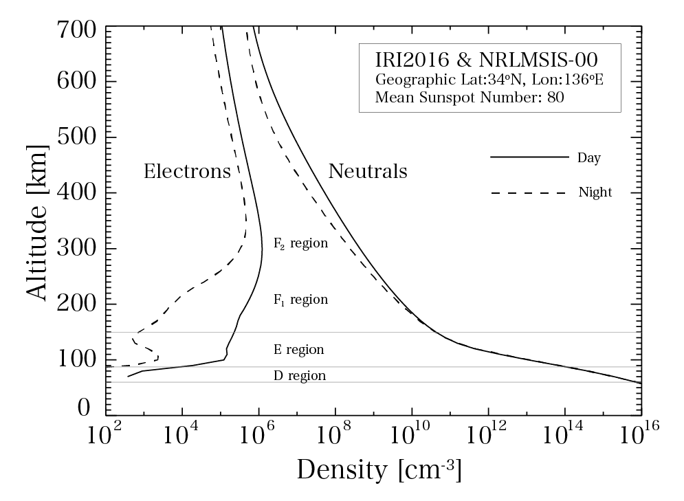 Earth's upper atmosphere is partially ionized due to the absorption of solar ultraviolet rays and X-rays and the impact of energized particles. The ionized atmosphere is called the ionosphere. As shown in the figure, the ionosphere expands over an altitude range from 60 to 1000 km, and is divided into areas such as the D, E, and F regions from its altitude distribution. (Figure 1).