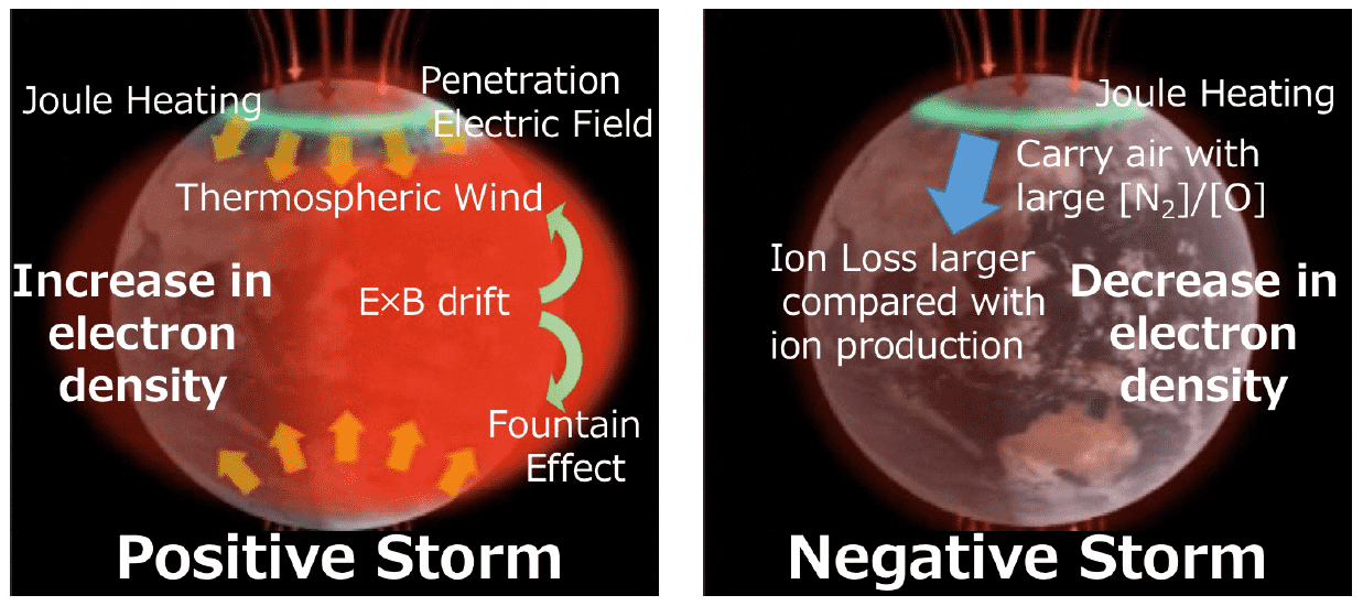 These regions vary both temporarily and spatially in response to variations in solar UV intensity and in the state of the background neutral atmosphere. In the vicinity of Japan, the electron density generally becomes larger at lower latitudes. The electron density has regular temporal variations such as daily and seasonal cycles and the approximately 11-year cycle associated with solar activity. In addition to the periodic variations, irregular disturbances also occur. For example, immediately after a large solar flare, the "Dellinger phenomenon", an irregular increase in the D region electron density, sometimes occurs, which can disrupt radio communications. When the magnetosphere is disturbed, an "ionospheric storm" may occur, in which the F region electron density significantly increases or decreases. Some local fluctuations such as a "sporadic E layer" and "equatorial plasma bubble" also frequently occur in particular seasons.