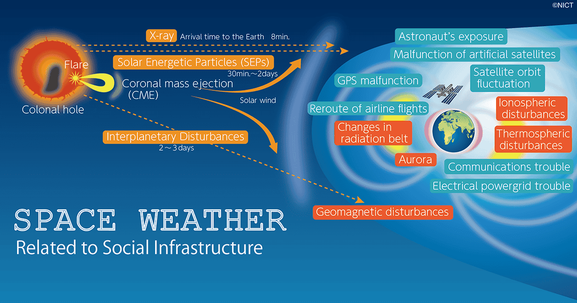 However, these two barriers are imperfect. Solar flares and coronal mass ejections generate a dense solar wind. When it is directed to Earth and the magnetic field in the solar wind is directed southward, harmful materials (ionized gases) penetrate into Earth’s magnetic field barrier to reach the near-Earth space. This affects the operations of artificial satellites and the International Space Station (ISS) outside of the atmosphere. Specifically, high-energy charged particles penetrating an artificial satellite cause the malfunction of electric devices, resulting in abnormal operation. In another case, relatively low energy charged particles charge the housing of an artificial satellite, and a short circuit of an electric device destroys the system. Astronauts are also at risk of being exposed to radiation.